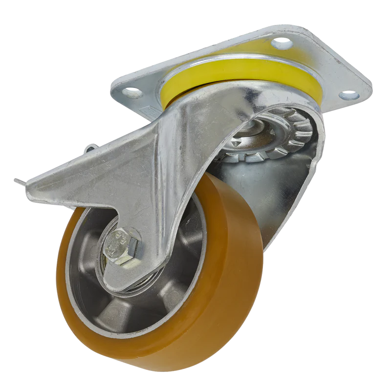 The total lock mechanism secures both the wheel rotation and the swivel movement, which helps keep equipment stable when movement must stop. This feature supports safety and stability in industrial, commercial, and workshop environments.