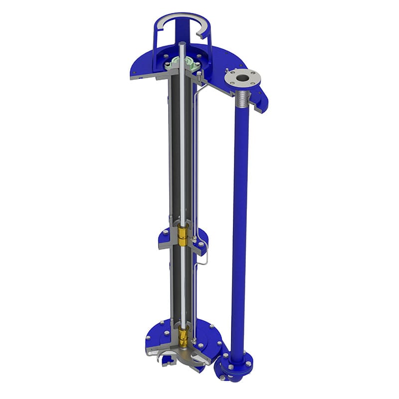 Vertical Long-Shaft Sump Pumps operate with the hydraulic end submerged in the liquid while the motor remains mounted above the sump. The long shaft transmits power efficiently, allowing safe pumping of corrosive, abrasive, or contaminated fluids.